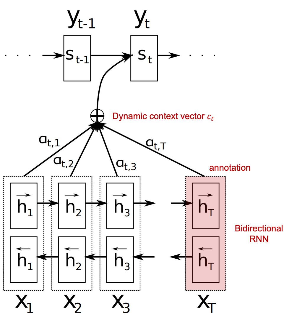 위 그림을 기준으로 설명하면, decoder에서 $s_t$을 출력할 때마다 encoder의 annotation들의 가중합 $c_t=\sum_{j=1}^{T}{\alpha_{tj}h_j.}$을 참고하는 방식입니다.