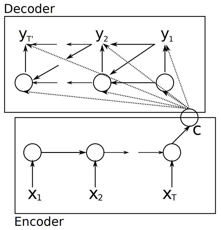 RNN을 사용한 기계 번역 모델의 토대인, 두 개의 RNN으로 구성된 encoder-decoder 모델은 cho et al. 2014에서 제안되었습니다. encoder에서 source sequence를 순서대로 입력받아 고정된 길이의 context 벡터 $C$로 만들고, 이 벡터를 decoder에서 입력받아 target sequence를 생성하는 구조입니다.