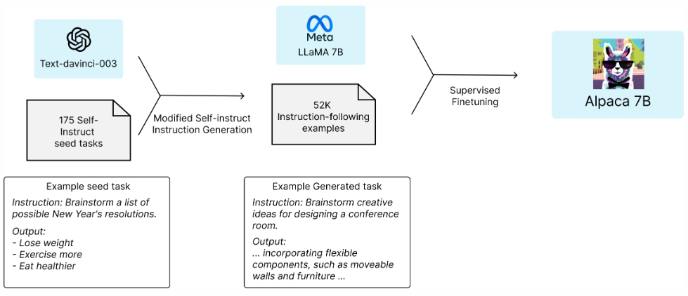 Alpaca는 이러한 instruction data를 GPT-3.5 API를 사용해 아주 저렴하게 만드는 방법을 보여주었다는 점에서 큰 의미를 갖는 모델입니다. Alpaca의 모델 구조와 instruction data를 만든 과정을 좀 더 자세히 살펴보겠습니다.