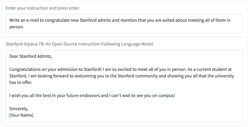 위 예시는 Alpaca 7B 모델이 실제로 생성한 답변 중 일부입니다. 사람이 직접 Alpaca 모델의 성능을 평가했을 때, GPT-3.5와 비슷한 품질의 답변을 생성했습니다.