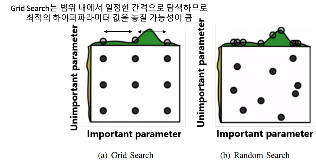 - Grid Search는 범위 내에서 일정한 간격으로 탐색하므로최적의 하이퍼파라미터 값을 놓칠 가능성이 큼