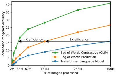 CLIP 이전에도 이미지와 텍스트 쌍을 학습 데이터로 쓴 연구는 많았지만, CLIP 만큼 대규모 데이터셋을 사용하지는 않았습니다. 저자들은 이렇게 데이터 규모를 확대한 것이 모델의 Zero-shot 성능을 끌어올린 핵심 요인임을 강조합니다. 아래 표에서 학습 이미지가 늘어날수록 Zero-shot 정확도가 꾸준히 상승하는 것을 확인할 수 있습니다.