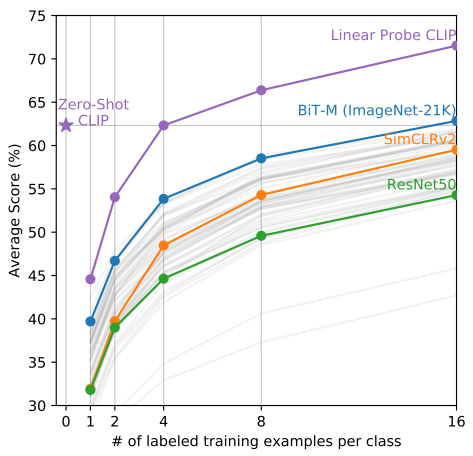 위 그래프는 CLIP의 Zero-Shot 성능(★)과 CLIP으로 학습한 representation을 freeze하고 softmax classifier를 붙여 Few-Shot 성능을 측정한 결과(Linear Probe CLIP), 그리고 다른 공개 모델들(BiT-M, SimCLRv2, ResNet50)의 Few-Shot 성능을 비교한 것입니다. CLIP의 Zero-Shot 성능이 다른 모델들의 Few-Shot 성능보다 대체로 높게 나타났습니다. 또한 CLIP의 Zero-Shot 성능은 4-shot과 비슷하고, 8-shot에도 근접한 성능을 보였습니다. Zero-Shot 성능이 여러 example을 사용해서 softmax classifier를 별도로 학습해야만 얻을 수 있는 성능에 도달한 것입니다.