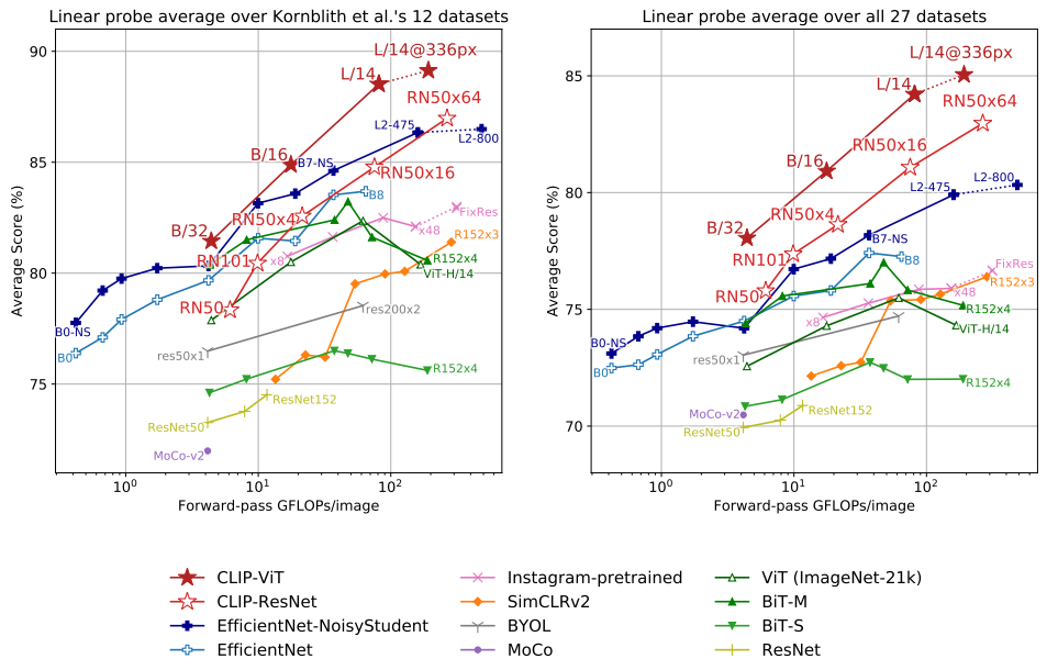 위 그래프는 다양한 모델의 Linear Probe 성능을 비교한 결과입니다. CLIP은 모델 크기를 키울수록 Linear Probe 성능이 꾸준히 상승했습니다. $x$축은 이미지 한 장을 추론하는 데 소요되는 연산량을 나타냅니다. 이 값이 작을 수록 가벼운 모델이고, 클 수록 무거운 모델입니다. 동일 연산량 기준 CLIP이 기존 SOTA보다 높은 정확도를 달성했습니다. 또한 CLIP-ResNet보다 CLIP-ViT이 연산 효율이 약 3배 높게 나타났습니다. 좌측 그래프를 살펴보면, CLIP-ViT-B/16 모델과 CLIP-ResNet50x16 모델은 약 85%의 정확도로 비슷한 성능을 보이지만 CLIP-ViT-B/16 모델이 훨씬 적은 계산량으로 동일한 성능을 달성한 것을 확인할 수 있습니다.
