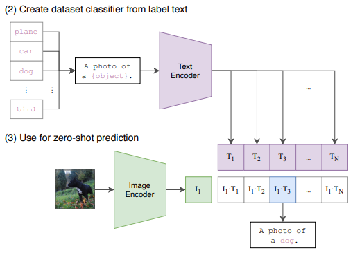 이렇게 분류기가 준비되면, 예측할 이미지를 Image Encoder에 입력해서 이미지 embedding을 구합니다. 그리고 텍스트 embedding과의 유사도를 계산해서 유사도가 가장 높은 문장을 찾습니다.