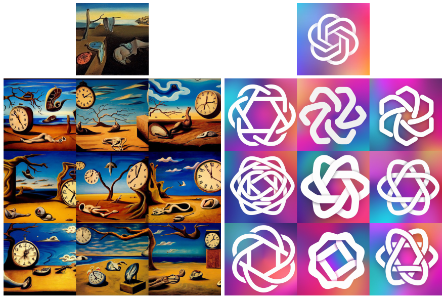 좌측 그림에서는 시계, 황야, 초현실적인 분위기 같은 의미적 요소는 그대로 유지되고, 시계 배치, 하늘 색감이나 구름 모양같은 디테일한 요소들은 변형되었습니다. 우측 그림에서도 로고 구조라는 핵심 의미는 유지되면서 배경의 그라데이션이나 로고 굵기, 비율 등은 다양하게 변형되었습니다.