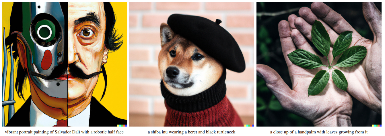 이와 달리 DALL-E 2는 이미지 생성 과정을 2단계로 나누어 텍스트 설명(caption)을 입력받아 이미지 embedding을 생성한 다음, 이미지 embedding을 조건으로 이미지를 생성합니다. 조건부 분포 $p(\text{image_embedding} \vert \text{text_caption})$를 명시적으로 모델링한 다음 $p(\text{image} \vert \text{image_embedding})$을 모델링하는 것입니다. 여기에서 이미지 embedding을 생성하는 데는 CLIP 모델을 사용하고, 이미지를 생성하는 데는 Diffusion 모델을 사용했습니다. 이 과정을 통해 이미지의 다양성을 향상시키고, 사진처럼 사실적이면서 텍스트 설명에 부합하는 이미지를 생성할 수 있었다고 합니다. 이제 DALL-E 2의 모델 구조, 학습 방법과 성능에 대해 좀 더 자세히 알아보겠습니다.