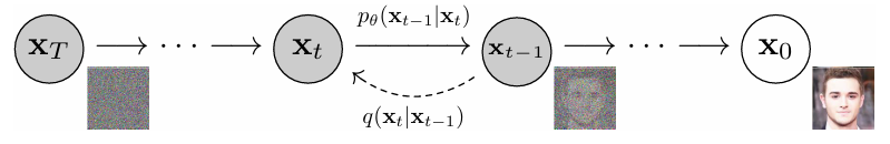 이번 포스트에서는 지난 포스트에 이어 Denoising Diffusion Probabilistic Models에 대해 좀 더 자세히 알아보겠습니다. 지난 포스트에서 설명한 바와 같이, DDPM은 데이터에 노이즈를 점진적으로 확산시킨 다음, 그 과정을 거꾸로 학습합니다.