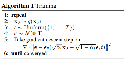 \[\lVert \mathbf{x_{t-1}}-\mu_\theta(x_t, t) \rVert^{2}=\frac{\beta_t}{1-\beta_t}\lVert \varepsilon_t-\varepsilon_\theta(x_t, t) \rVert^{2}\]결과적으로, DDPM에서 역방향 확산 과정에서는 노이즈 $\varepsilon$를 추정하게 됩니다.