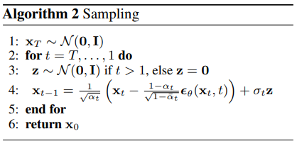 \[\nabla_{x_t}\,\log p_t(x_t) = -\frac{\sqrt{1-\bar{\alpha}_t}\varepsilon}{1-\bar{\alpha_t}}=-\frac{\varepsilon}{\sqrt{1-\bar{\alpha}_t}}\]이미지 생성(샘플링)