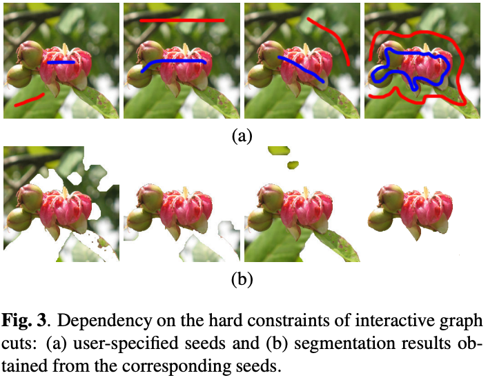 - 최초에 사용자가 seed를 설정하는 과정이 필요하고(그림 (a)처럼 대략적으로 어떤 부분이 object 또는 background인지), seed를 어떻게 설정하느냐에 따라서 segmentation quality가 좌우됨 (아래 이미지)