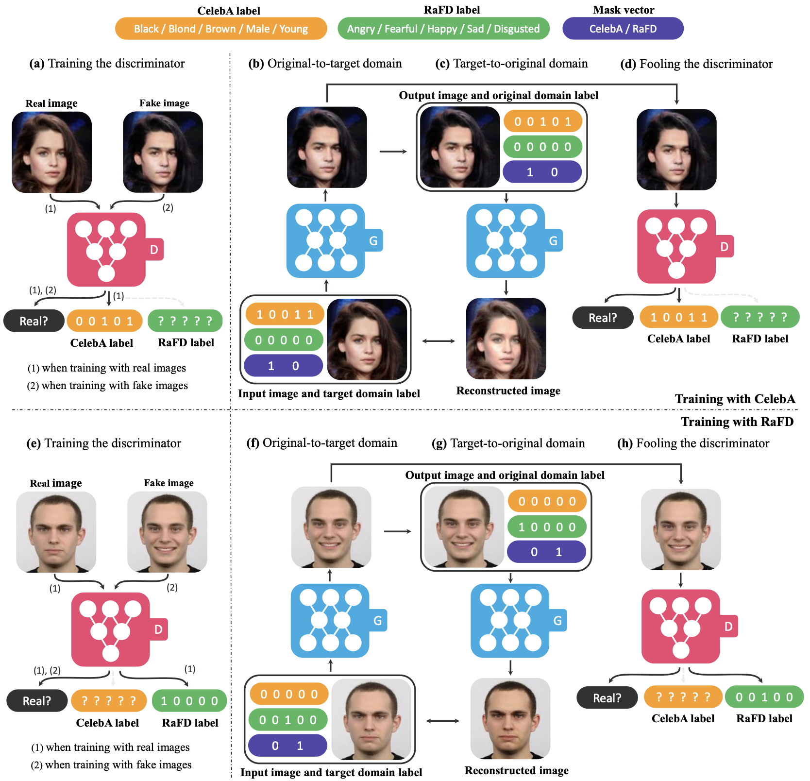 - $G(x,c) \rightarrow y$ generator가 input 이미지 $x$를 target domain label $c$로 생성한 output 이미지 $y$