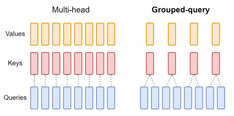 Llama 2도 여느 LLM들과 비슷하게 auto-regressive transformer 구조를 기반으로 만들어졌습니다. 여기에 성능 향상을 위해 몇 가지 사항들을 변경했습니다. 그 중에서도 34B, 70B 모델에 대해서 Grouped-Query Attention(GQA)를 사용한 것이 주목할 만한 변화인데요. 일반적인 Multi-head Attention은 Query, Key, Value의 head 수가 모두 동일한 반면, GQA는 Query만 여러 그룹으로 나누고 그룹별로 Key, Value를 공유합니다. Llama 2-70B 모델의 경우, Query head는 64개, Key/Value head는 8개를 사용합니다. Key, Value의 크기를 줄여서 메모리와 연산량을 크게 절약한 것입니다.