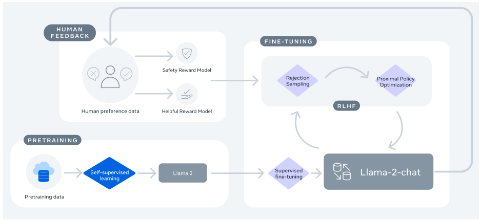 Reward Modeling: 같은 질문에 대해 모델이 여러 답변을 생성하면, 사람 평가자가 어느 답변을 선호하는지 수집합니다. 이 데이터(Human preference data)를 사용해서 모델의 답변에 대한 사람의 선호도를 예측하는 보상 모델을 학습합니다.Llama 2에서는 두 개의 보상 모델