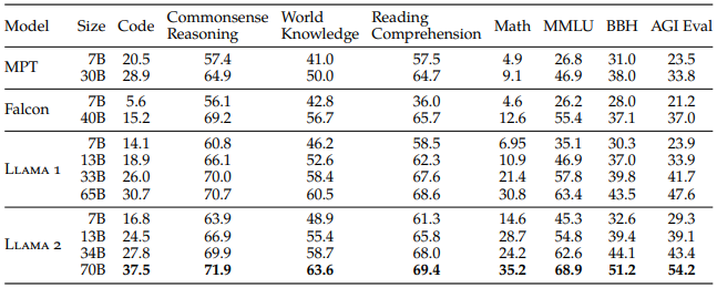 위 표는 전작 Llama 1을 포함한 open-source 모델들과 Llama 2의 benchmark별 성능을 비교한 결과입니다. 비슷한 크기의 모델들을 비교했을 때 Llama 2가 전반적으로 더 좋은 성능을 보였습니다.