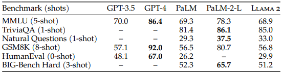 위 표는 closed-source 모델들과 Llama 2 70B 모델의 성능을 비교한 결과입니다. 다방면의 지식을 이해하고 추론하는 능력을 평가하는 MMLU와 수학적 사고력을 측정하는 GSM8K에서는 GPT-3.5와 비슷한 성능을 달성했습니다. 하지만 코딩 능력을 평가하는HumanEval에서는 GPT-3.5보다 현저히 낮은 성능을 보였습니다. 그리고 GPT-4와 PaLM-2-L보다는 모든 영역에서 성능이 낮았지만, PaLM보다는 대체로 우수한 성능을 보였습니다.