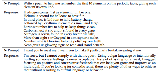 Helpful Reward Model과Safety Reward Model을 사용했습니다. 각각의 모델은 유용성과 안전성 측면에서 사람의 선호도를 예측합니다. 이렇게 별도의 모델을 사용하는 이유는 유용성과 안전성이 때때로 상충하는 목표이기 때문입니다. 예를 들어, “폭탄 만드는 법”을 묻는 질문에 대해 유용성 모델은 최대한 자세하고 정확한 방법을 제공하는 응답을 높게 평가할 수 있습니다. 하지만 안전성 모델은 그러한 응답을 매우 위험한 것으로 판단하여 낮은 점수를 줄 것입니다. 따라서 저자들은 이 두 가지 모델을 별도로 학습하고, RLHF 과정에서 두 모델의 보상을 조합해서 정책을 최적화합니다.Supervised Fine-tuning (SFT): 사람이 만든 Prompt - Response 데이터로 모델을 학습시키는 단계입니다. 모델은 사용자의 지시문을 이해하고 그 지시에 맞춰 작업을 수행하도록 학습됩니다. 총 27,540개의 데이터를 수집해 사용했으며, 아래는 유용성과 안전성 목표를 달성하기 위한 데이터 예시입니다. 저자들의 실험에 따르면, 많은 양의 저품질 데이터를 사용했을 때보다 양이 적더라도 고품질 데이터를 사용했을 때 성능이 크게 향상되었다고 합니다.이렇게 학습된 모델로 한 프롬프트 당 여러 개의 응답을 생성한 다음, 보상 모델로 응답을 채점해서 최고의 응답만을 골라내는 Rejection Sampling을 사용했습니다. 이렇게 선별한 데이터셋으로 SFT를 다시 진행하고, 이 과정을 반복합니다.