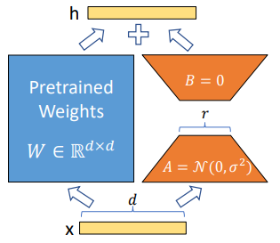 - 각 Transformer weight $W$ ($d \times d$) 옆에 $A$ ($r \times d$), $B$ ($d \times r$) 두 행렬을 삽입