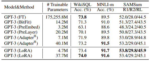 위 성능 결과 표에서도 확인할 수 있듯이, LoRA는 매우 적은 수의 파라미터(4.7M)만을 학습해서 GPT-3 full fine-tuning(FT)과 비슷하거나 더 좋은 성능을 달성했습니다. 학습 파라미터 수는 약 37,000배 감소시켰습니다.