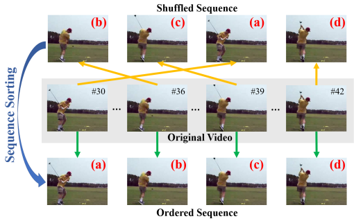 Vision 분야에서는 주어진 비디오나 이미지를 원본과 다르게 변형해서 proxy label을 만듭니다. 아래 예시에서는 비디오에서 임의로 4장의 프레임을 뽑아 순서를 뒤섞은 다음, 모델이 올바른 순서로 재배열하도록 학습합니다. 원래 순서가 곧 정답 순서이기 때문에 별도의 라벨링없이 학습할 수 있습니다.