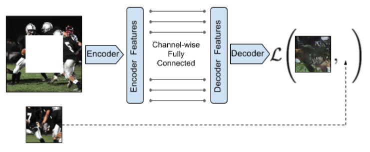 아래 예시에서는 모델이 이미지의 가려진 영역을 복원하는 task를 수행합니다. 모델이 복원한 이미지와 원본 이미지와의 차이를 계산해 loss로 사용합니다. 라벨로 사용되는 원본 이미지는 이미 가지고 있기 때문에 라벨링이 필요하지 않습니다.