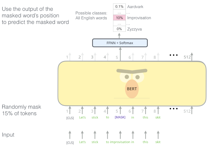 대표적인 LLM 모델 중 하나인 BERT도 문맥 이해도를 높이기 위해 Self-supervised learning을 사용했는데요. BERT를 pretrain할 때 수행한 두 가지의 task인 Masked Language Learning(MLM)과 Next Sentence Prediciton(NSP)입니다. MLM은 주어진 문장의 일부 토큰을 [MASK]로 대체해서 가리고 모델이 마스킹된 토큰을 예측하는 task입니다. proxy label로 사용할 15%의 토큰을 랜덤하게 골라서 [MASK] 토큰으로 바꿔주기만 하면 되기 때문에 별도의 라벨링 작업이 필요하지 않습니다.