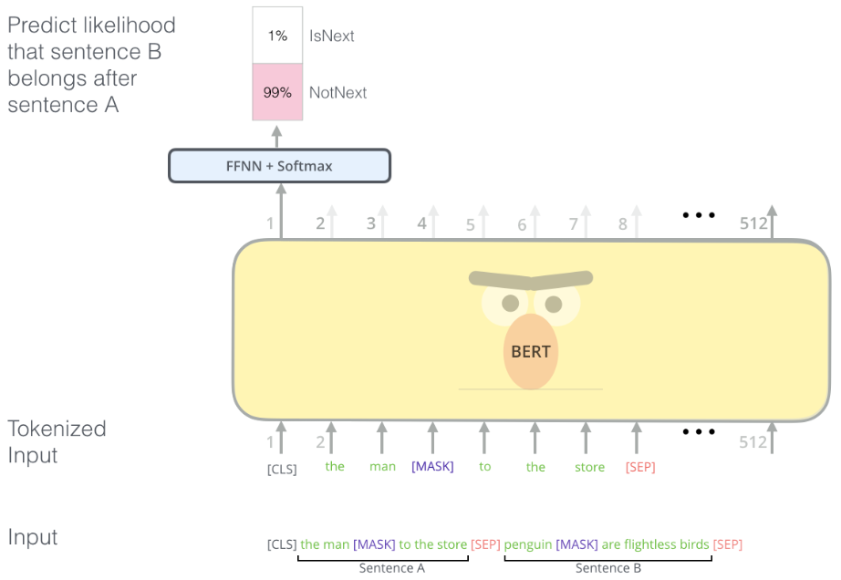 다음으로 NSP는 주어진 두 개의 문장이 이어지는 문장인지 아닌지 맞추는 task입니다. 절반은 실제로 이어지는 두 문장을, 나머지 절반은 랜덤하게 골라 데이터셋을 만들어 학습을 진행합니다. 이 역시 라벨링이 필요하지 않은 task입니다.
