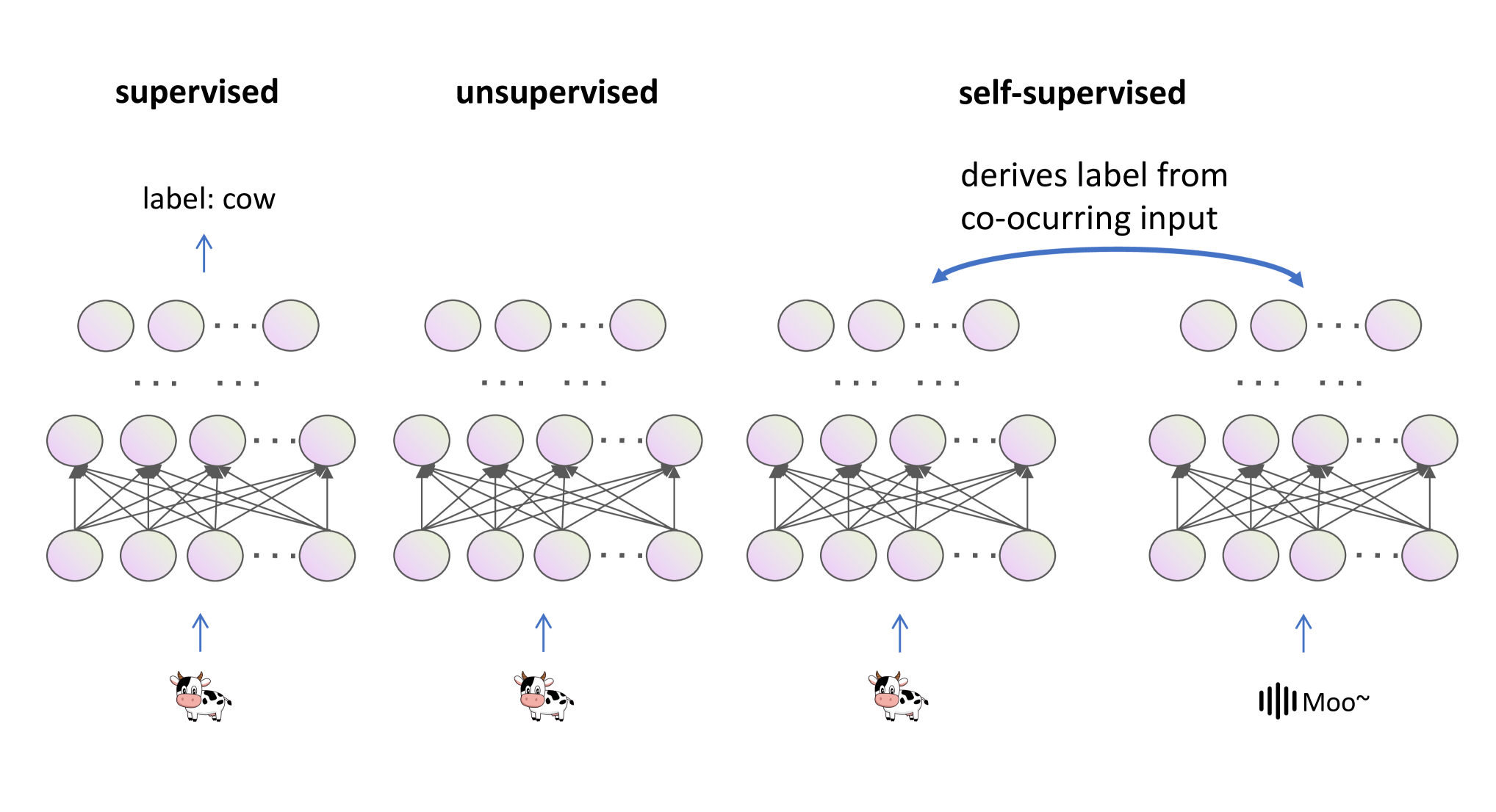 Self-supervised learning은 데이터 자체로부터 파생된 가짜 라벨(proxy label)을 예측해 데이터 embedding을 학습합니다. 위 그림의 Self-supervised learning에서 소 이미지와 소 울음소리는 Supervised learning처럼 명시적으로 라벨링되어 있지 않습니다. 대신, 두 데이터가 동시에 등장한다는 사실이 암묵적으로 proxy label 역할을 하게 됩니다.