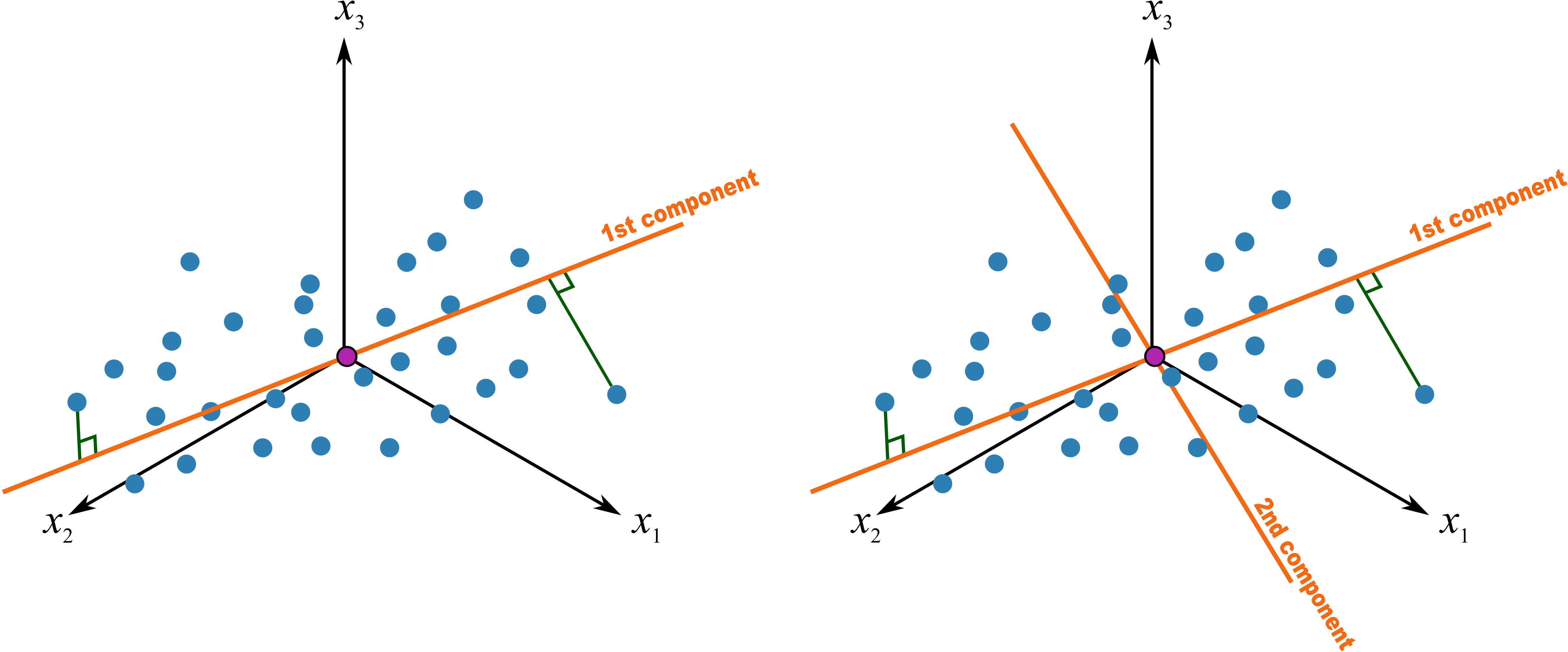 이번 포스트에서는 대표적인 차원 축소 기법 중 하나인 PCA에 대해 살펴보겠습니다. PCA는 주어진 데이터의 분산을 최대한 보존하면서 고차원 상의 데이터를 저차원 데이터로 변환하는 기법입니다. 아래 그림(출처)에서와 같이 데이터의 분산을 최대한 보존하는, 서로 직교(orthogonal)하는 축(component)을 찾고 그 축에 데이터를 projection함으로써 데이터의 차원을 줄이는 동시에 데이터에 포함되어 있는 noise를 제거할 수 있습니다. 아래 예시에서는 3차원이었던 데이터를 2개의 축(1st component와 2nd component)에 projection함으로써 2차원 데이터로 변환하는 과정을 보여주고 있습니다.