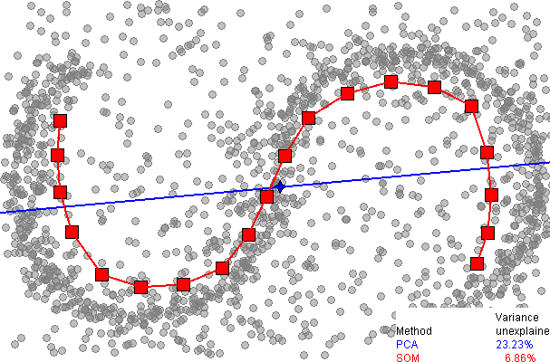 다시 말해 PCA의 목적은 데이터의 분산을 최대한 보존하는, data point와 preojected data의 거리를 최소화하는 linear subspace를 찾는 것입니다. 그런데 PCA를 비선형 데이터에 적용하면 어떻게 될까요? 아래 그림(출처)은 PCA와 비선형 차원 축소 기법인 Self Organizing Map(SOM)에 비선형 데이터를 적용한 결과를 비교하여 보여주고 있습니다.