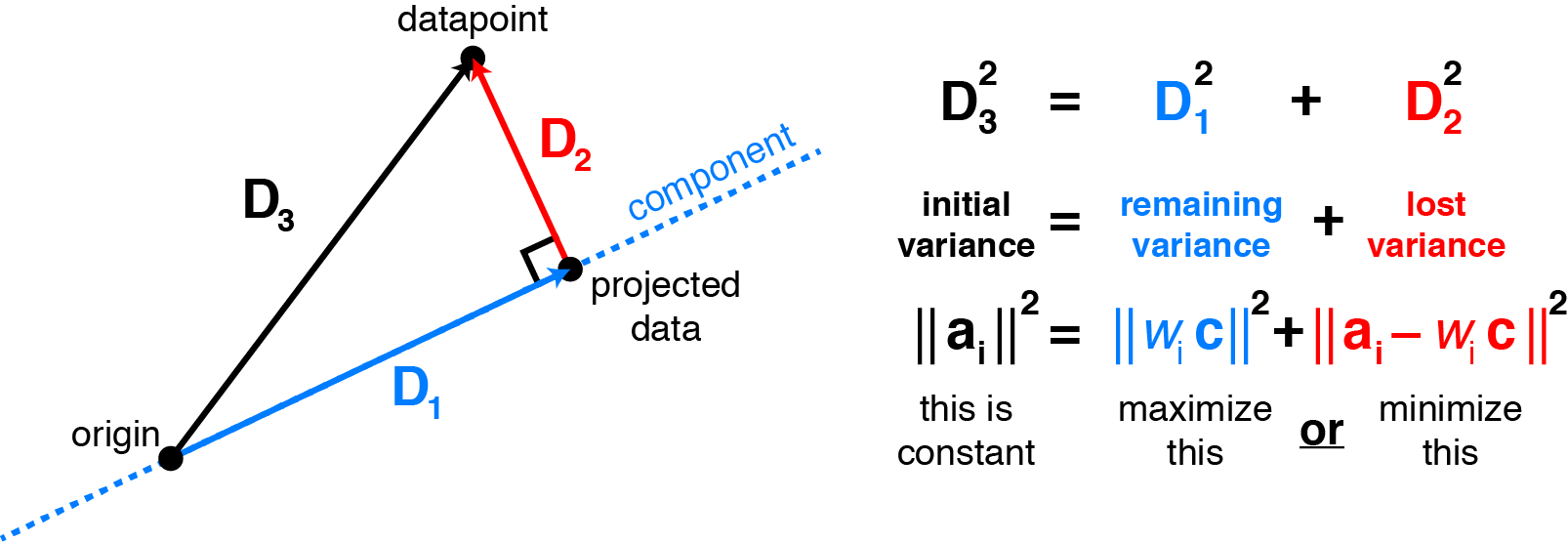PCA에서 데이터를 projection하는 축(compoenet)에 대하여 좀 더 자세히 살펴보겠습니다. 이 축은 ‘데이터의 분산을 최대한 보존하는 특성을 갖는다’라고 앞서 언급한 바 있는데요. 이는 곧 ‘data point와 projected data의 거리(residual)를 최소화하는 특성을 갖는다’는 말과 같다고 볼 수 있습니다. 원데이터의 분산($D_3$), 축에 의해 보존되는 분산($D_1$)과 projection 과정에서 손실되는 분산($D_2$)은 다음(출처)과 같은 관계에 있기 때문입니다.