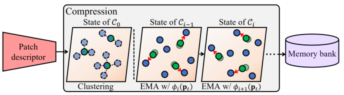 위 그림은 학습 데이터셋의 이미지들을 하나씩 거치면서 Memory bank를 구성하는 과정을 보여줍니다. 초록색 동그라미는 이전 시점의 Memory bank를 나타내고, 파란색 동그라미는 현재 시점의 정상 이미지로부터 얻은 patch feature를 나타냅니다.