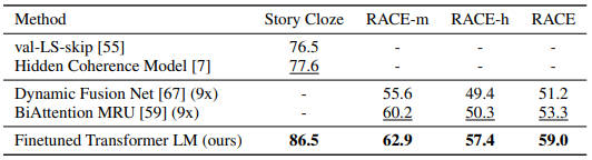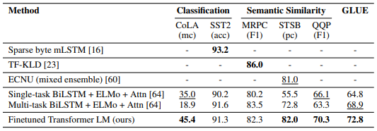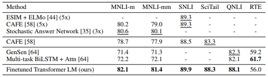 GPT-1(위 표에서는 Finetuned Transformer LM으로 표기)은 대부분의 데이터셋에서 ELMo를 포함한 선행 연구들보다 뛰어난 성능을 나타냈습니다.