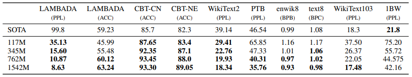 GPT-2는 zero-shot task에서 8개의 데이터셋 중 7개에 대해 선행연구들보다 뛰어난 성능을 나타냈습니다. 1BW(1B Word Benchmark, ELMo pre-training에 사용된 데이터셋)에서는 낮은 성능을 나타냈는데요. 1BW에서는 문장들의 순서가 랜덤하게 섞여있어 문장 간 의존성이 없기 때문이라고 볼 수 있습니다.