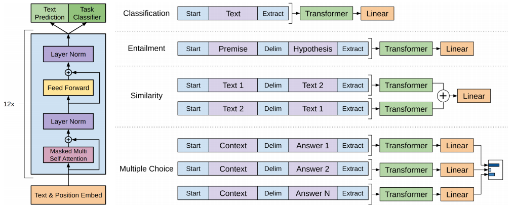 위 이미지와 같이, task 별로 변형된 input이 사전 학습된 Transformer에 입력되고 Transformer의 output은 linear+softmax layer에 입력됩니다. task별 입력 구조의 차이(task-aware input transformations)로 인해 모델 구조에 약간의 차이가 있지만, 대체로 동일한 구조를 갖습니다.