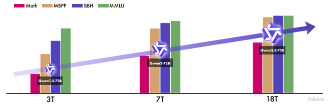 Pre-training 데이터셋을 기존(Qwen 2) 7조 토큰에서 18조 토큰으로 늘렸는데요. 지식, 코딩, 수학 영역을 중점적으로 보강했습니다.