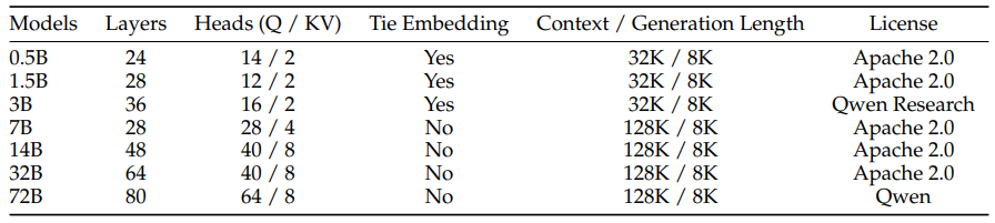 Dense Transformer를 사용하는 모델은 작은 규모(0.5B)부터 큰 규모(72B)까지 다양한 크기로 공개되었습니다. 이 중 Qwen 2.5-3B와 Qwen 2.5-72B를 제외하고 Apache 2.0 라이센스에 해당하는 나머지 모델들은 상업적으로도 사용이 가능합니다.