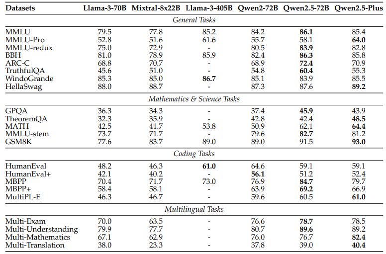위 표는 Qwen2.5-Plus 모델과 70B 이상의 대규모 오픈소스 모델들의 성능을 비교한 것입니다. 이 표의 핵심은 Qwen2.5-Plus가 MoE 구조를 사용하여 활성화 되는 파라미터 수가 훨씬 적음에도 불구하고, 경쟁 모델들과 대등하거나 더 우수한 성능을 보여준다는 점입니다.