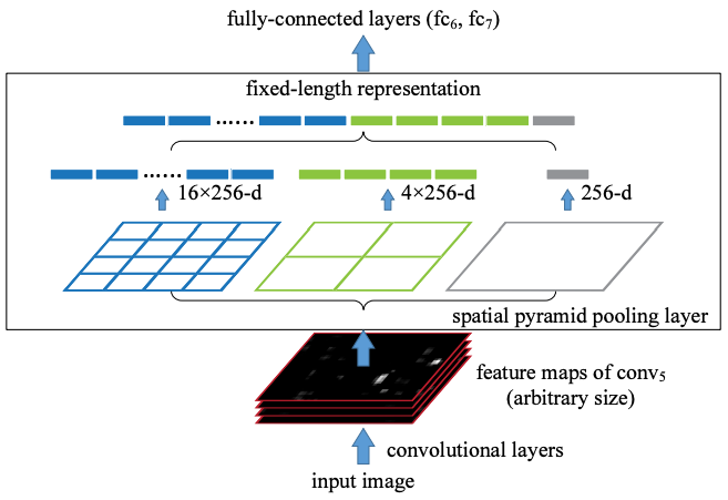 input layer임의의 사이즈 및 가로세로비를 갖는 이미지 입력 →convolutional layerfeature map 생성 →SPP layer고정된 길이의 output을 생성(information aggregation) →fully connected layer에 입력