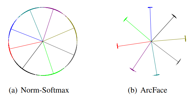 얼굴 인식의 핵심은 같은 사람은 feature space에서 가깝고, 다른 사람은 멀리 배치하는 것입니다. 하지만 기존 softmax(a)는 feature 간의 각도를 충분히 구분하지 못해 decision boundary가 명확하지 않다는 문제가 있었습니다. ArcFace(b)는 여기에 angular margin을 추가해 같은 클래스는 더 촘촘히 모이고, 다른 클래스는 더 멀어지도록 유도하여 구분력을 극적으로 높였습니다.