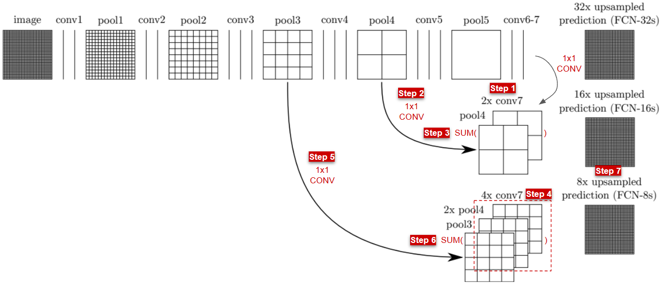 Step 1conv7의 output feature map에 $1 \times 1$ conv를 적용한 뒤, 2배 upsampling 합니다.Step 2pool4의 output feature map에 $1 \times 1$ conv를 적용합니다.Step 3Step 1과Step 2을 더합니다.Step 4Step 3을 2배 upsampling 합니다. (2x pool4, 4x conv7)Step 5pool3의 output feature map에 $1 \times 1$ conv를 적용합니다.Step 6Step 4와Step 5를 더합니다.Step 7Step 6을 8배 upsampling 합니다.