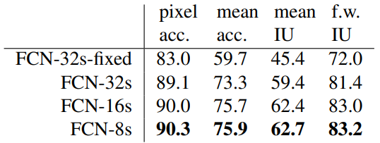 - 또한 마지막 레이어만 fine-tuning(FCN-32s-fixed) 했을 때보다 전체 레이어를 fine-tuning 했을 때 정확도가 더 높았습니다.