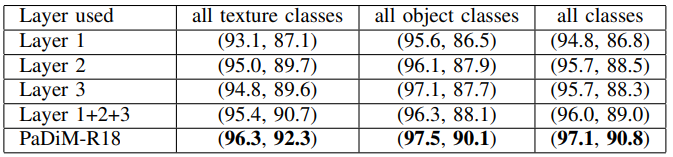 이러한 방식으로 만들어진 embedding vector는 서로 다른 semantic level과 resolution으로부터 나온 정보를 포함하고 있어서 localization 성능을 향상시킵니다. 위 표에 따르면 layer 각각의 output을 patch embedding vector로 사용(Layer 1, Layer 2, Layer 3)했을 때보다 세 개의 output을 합쳤을 때(Layer 1+2+3) anomaly localization 성능이 더 높습니다. 그리고 모든 위치의 patch를 multivariate Gaussian distribution으로 표현해서 layer output 간의 상관관계를 함께 고려했을 때(PaDiM-R18) 성능이 가장 높다는 것을 확인할 수 있습니다.