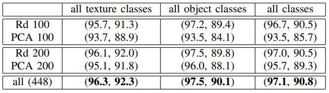 \[X_{ij}=\{ {x_{ij}}^k, k\in [1, N] \}\]그리고 patch embedding vector가 불필요한 정보를 포함하고 있을 수 있기 때문에 차원축소 과정을 거칩니다. 저자들의 실험에 따르면, 단순히 일부 dimension을 랜덤하게 선택(Rd)하면 성능은 유지하면서 PCA보다 더 효율적으로 차원을 축소할 수 있다고 합니다. 위 표는 차원축소 없이 모든 dimension을 사용한 결과(all)와 차원축소를 거친 결과(Rd, PCA)의 차이를 보여줍니다.