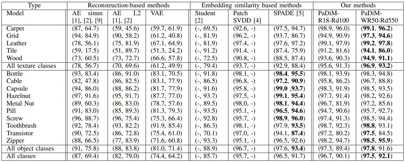 PaDiM은 texture class에서 높은 성능을 보였습니다. 반면에, object class에서는 SPADE보다 낮은 성능을 보였는데요. 이는 PaDiM이 각각의 위치에서 정상 이미지 전체를 관통하는 통계적 유사성을 효과적으로 잡아내는 특징이 있기 때문입니다.