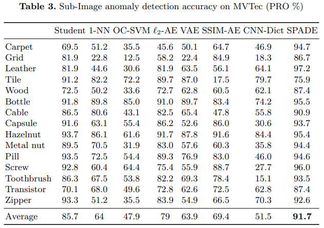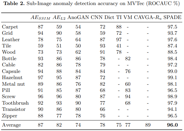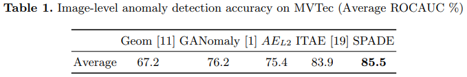 K nearest neighbor(KNN) 방식은 학습 데이터 크기에 비례하여 복잡도가 증가합니다. 모든 데이터 조합의 거리를 구해야 하기 때문인데요. 앞서 설명한 바와 같이, SPADE에서는 image level(두 번째 단계)과 sub image level(세 번째 단계) 이상탐지를 수행할 때 KNN 방식을 사용합니다. sub image level 이상탐지 시에는 이전 단계에서 찾아낸, 고정된 개수의 이미지 $K$개만을 대상으로 pixel feature들 사이의 거리를 구하긴 하지만, image level 이상탐지를 수행할 때는 테스트 이미지 $y$와 학습 데이터에 포함된 모든 정상 이미지들 사이의 거리를 구해야 합니다. 따라서 학습 데이터가 커지면, 그만큼 계산 시간이 많이 소요된다는 한계점이 있습니다.