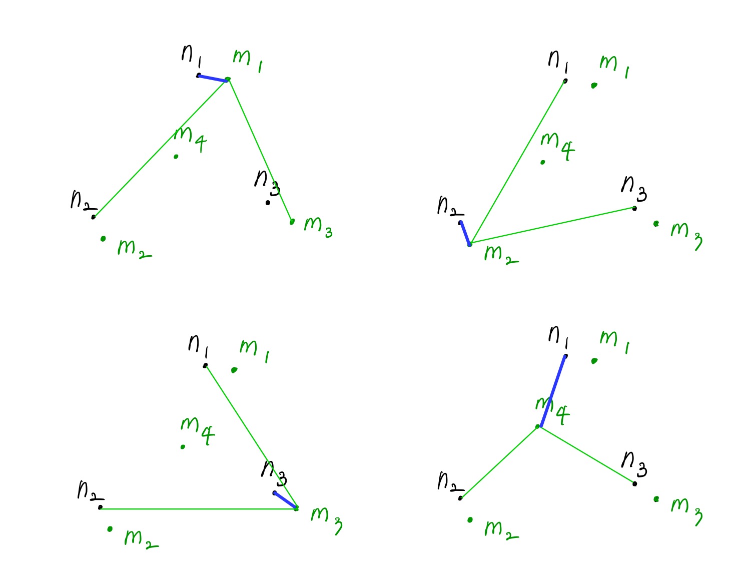 극단적인 예로, 아래와 같이 현재까지 sampling한 $\mathcal{M}_C= { n_1, n_2, n_3 }$이고, $m_1, m_2, m_3, m_4$ 중에서 다음 feature를 sampling 한다고 가정해 보겠습니다. 먼저 $m_1, m_2, m_3, m_4$ 각각을 기준으로 $n_1, n_2, n_3$과의 거리를 구한 뒤 최솟값을 찾습니다. 파란색으로 표시한 각각의 최소 거리 중 최댓값을 갖는 것은 $m_4$이므로, $m_4$를 sampling 합니다. $m_1, m_2, m_3$ 보다 $m_4$를 sampling 했을 때 Memory Bank 내 feature들이 고르게 분포함을 확인할 수 있습니다.