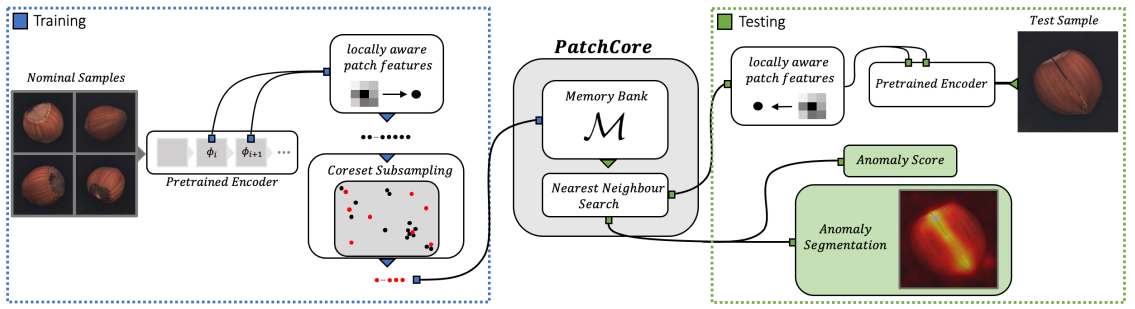 PatchCore는 SPADE와 PaDiM의 특징을 합친 모델로, SPADE의 Gallery와 비슷한 역할을 하는 Memory Bank를 사용합니다. 또한 PaDiM처럼 patch level 접근법을 사용하는데, 이웃한 pixel feature들을 묶어서 patch feature를 만든다는 것이 PaDiM과의 차이점입니다. 테스트 시에 테스트 이미지의 patch feature들과 Memory Bank에 저장된 patch feature들의 거리를 계산하여 비교하기 때문에, 정상 이미지의 특징을 압축하여 표현할 수 있는 고품질의 Memory Bank를 구성하는 것이 무엇보다 중요한 모델입니다. 본 포스트에서는 PatchCore가 이상탐지를 진행하는 과정과 함께 MVTec 데이터셋으로 모델 성능을 평가한 결과를 살펴보겠습니다.