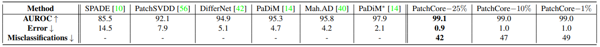 - coreset subsampling을 수행하지 않으면(PatchCore-100%) SPADE보다 성능은 높지만 inference time이 더 오래 소요됩니다.