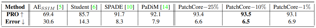 PatchCore 실험 결과: anomaly segmentation(PRO)